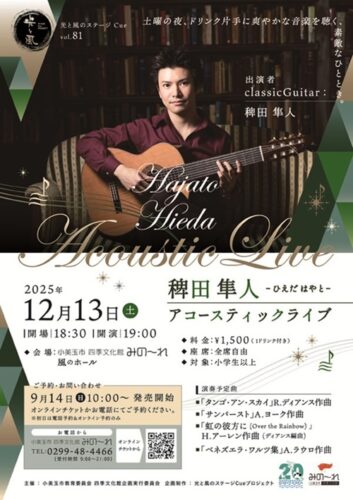 作曲家、ギタリストとして活躍する、つくば市出身の稗田隼人(ひえだ はやと)によるワンドリンク付きのクラシックギターのライブです。ドリンク片手にギターの音色を楽しみませんか。
