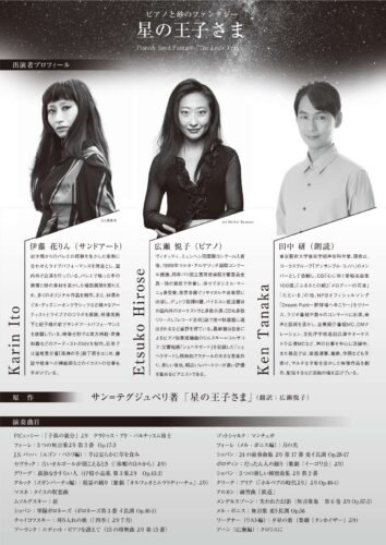 世界中で愛されるサン=テグジュペリの名作「星の王子さま」。その幻想的な世界観を、広瀬悦子による選曲とピアノ演奏、田中研による朗読、伊藤花りんによるサンドアートで紡ぎます。本当に大切なもの、美しいものを想う儚い物語をお楽しみください。