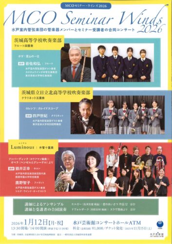 水戸室内管弦楽団(MCO)メンバーによるレッスンを受けた3つの管楽器アンサンブルのレッスンの成果を発表します。