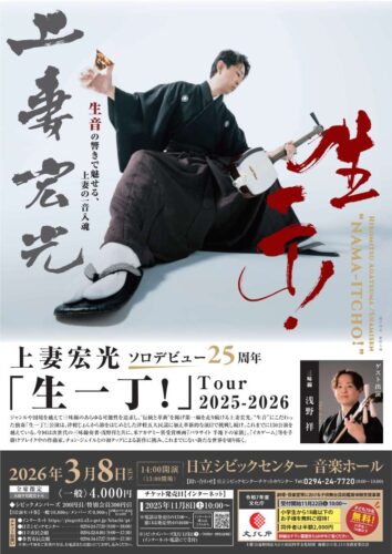 ジャンルや国境を越えて三味線のあらゆる可能性を追求し、”伝統と革新”を掲げ第一線を走り続ける日立市出身の上妻宏光。“生音”にこだわった三味線独奏「生一丁!」公演は、津軽三味線の真骨頂である津軽五大民謡に加え、革新的な演目で挑戦し続け2001年より通算150公演を越えています。今回はゲストに国内外で活躍する、気鋭の三味線奏者・浅野祥を迎え、映画「パラサイト~半地下の家族」や人気ドラマ「イカゲーム」の音楽監督であるチョン・ジェイルとの初タッグによる新作に挑みます。
