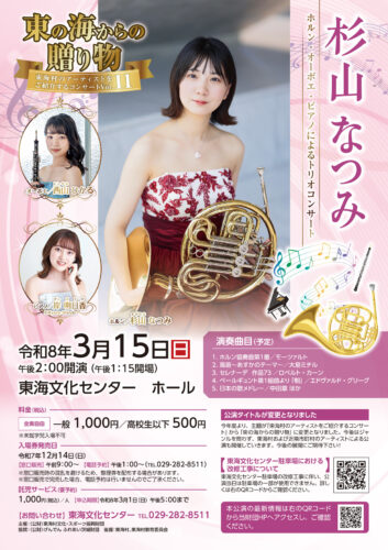 東海村にゆかりのあるアーティストを地元の皆さんに紹介するコンサートです。今回はホルン奏者の杉山なつみによる、オーボエ・ピアノとのトリオ演奏やトークをお楽しみください。