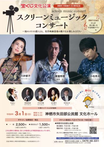 神栖市市制施行20周年記念して開催されるコンサート。一流のソリスト達による演奏で「さんぽ」、「星に願いを」、「宇宙戦艦ヤマト」などの名作映画音楽をお楽しみいただけます。