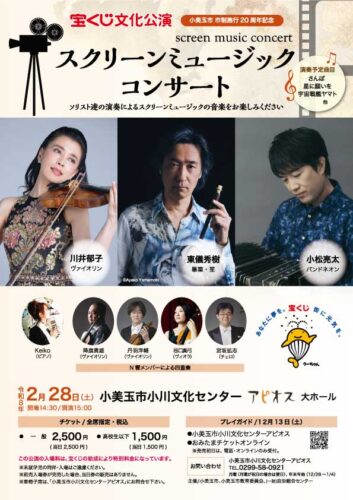 小美玉市市制施行20周年記念して開催されるコンサート。一流のソリスト達による演奏で「さんぽ」、「星に願いを」、「宇宙戦艦ヤマト」などの名作映画音楽をお楽しみいただけます。
