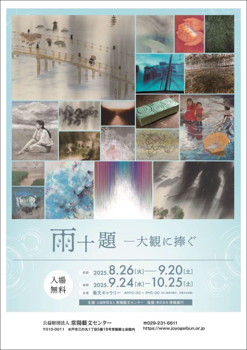 日本画家・横山大観が京を舞台に雨の表情と景色を描いた「洛中洛外雨十題」10点のうち、株式会社常陽銀行が所蔵する4点を二期に分けて2点ずつ展示します。そのほかに日本画、洋画、デザイン、彫刻などジャンルを交えて現代作家の作品8点を加えて「雨十題」としました。前期は自然の風景や印象を捉えた作品を、後期は人物や暮らしの気配を感じる作品をテーマに合計19点(うち1点は通期)を展示紹介します。