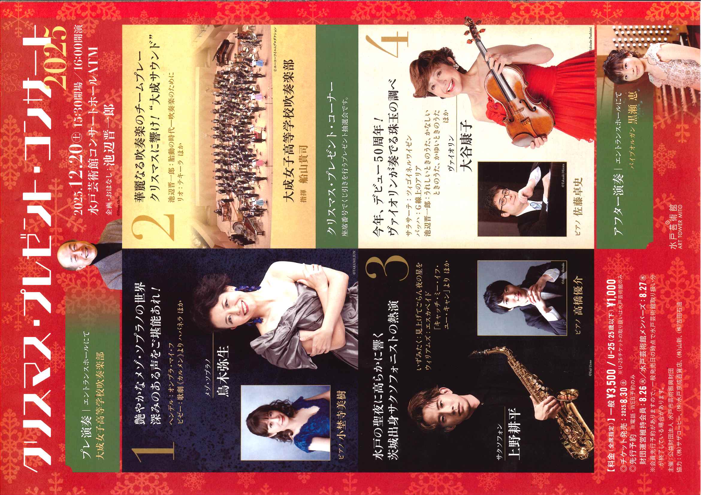 水戸市出身で日本を代表する作曲家・池辺晋一郎氏の企画とおはなしでお贈りするクリスマス・プレゼント・コンサート。今年はメゾ・ソプラノ、吹奏楽、サクソフォン、ヴァイオリンの豪華な演奏家たちを招き、音楽で美しくクリスマスを彩ります!