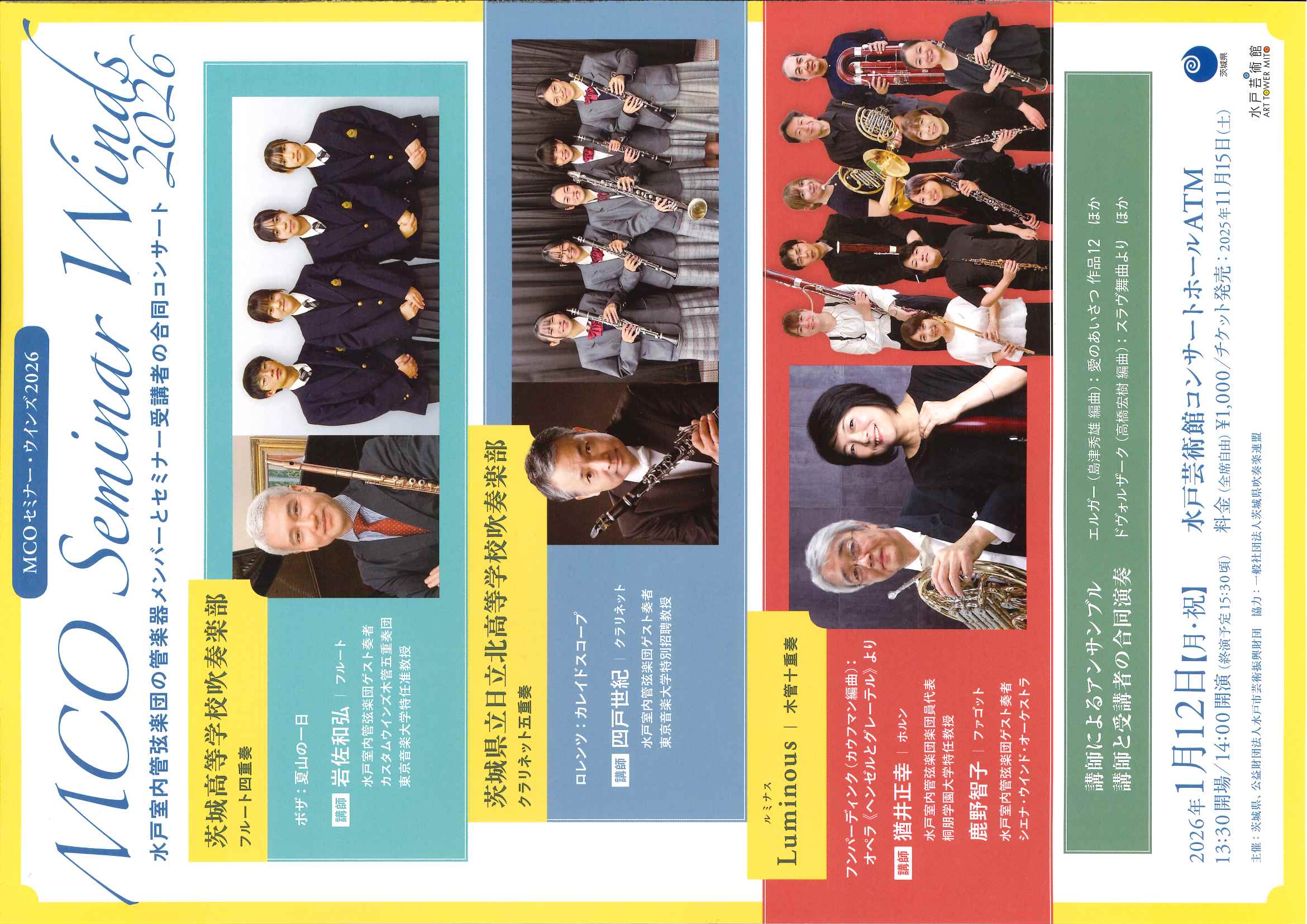 水戸室内管弦楽団(MCO)メンバーによるレッスンを受けた3つの管楽器アンサンブルのレッスンの成果を発表します。
