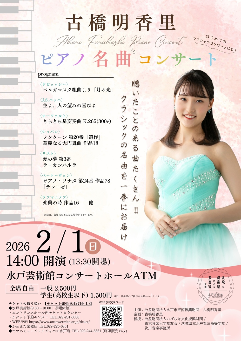 水戸市出身のピアニスト・古橋明香里と公益財団法人水戸市芸術振興財団(水戸芸術館)が共催で行うコンサート。コンセプトは「クラシックコンサートに馴染みのない方でも気軽に行ける」コンサートで、誰もが耳にしたことのあるクラシック有名曲を中心にプログラムされています。